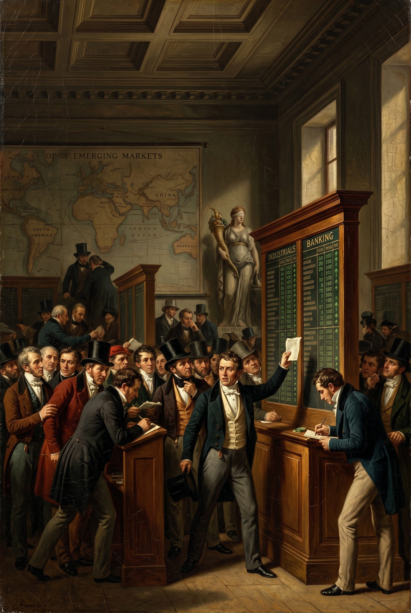 BlackRock upgrades EM to overweight on AI hardware exporters and Latin American commodity producers while ML's historical framework argues markets price recovery before clarity.